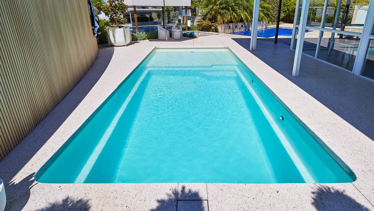 The 7.2 metre Sunseeker Slimline includes both shallow and deep swimming areas, making it suitable for a wide range of family activities. Like all Barrier Reef Pools designs, the Sunseeker Slimline incorporates non-slip benches and steps, smooth edges and a continuous safety ledge to support safer swimming for junior users, along with a vibrant range of shimmer pool colours.