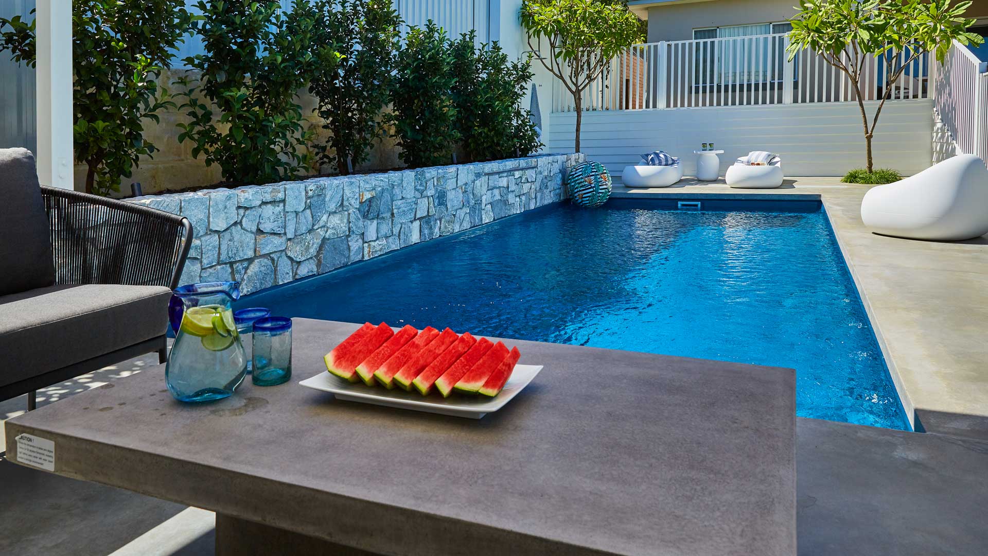 This Billabong pool installation uses a mix of contemporary elements, stone wall cladding, lighter pavers and plants to highlight the Royal Jade Shimmer pool colour. An idyllic paradise for the family, there’s no limit to how the pool space can be used. Make use of the shaded area at the back of the backyard and kick back and relax, or bask under the sun rays in the chairs on the other end. This Billabong pool is in a 8.5m x 3.8m configuration, perfect for medium to large backyards!