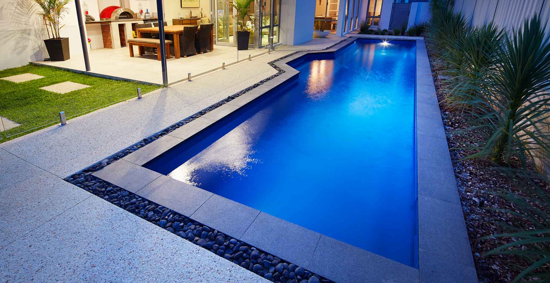 This striking 12.2m x 3.45m lap pool in Pacific Shimmer delivers a sleek, purposeful design to this Walter Road property. Built for both fitness and relaxation, the elongated layout offers plenty of space for swimming laps while also providing a calm spot to unwind. The Pacific Shimmer finish casts a crisp, refreshing blue hue, giving the water a clean, modern look that complements the outdoor setting. It’s a refined addition that blends practicality with style—an ideal fit for the easygoing lifestyle on Walter Road.